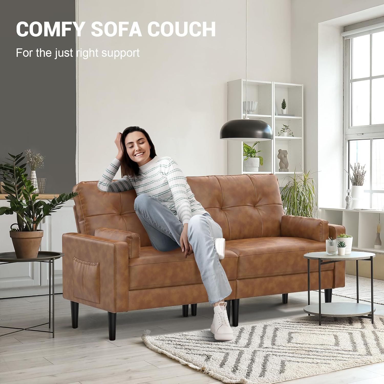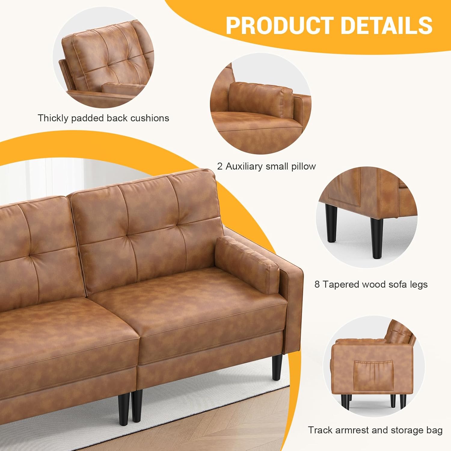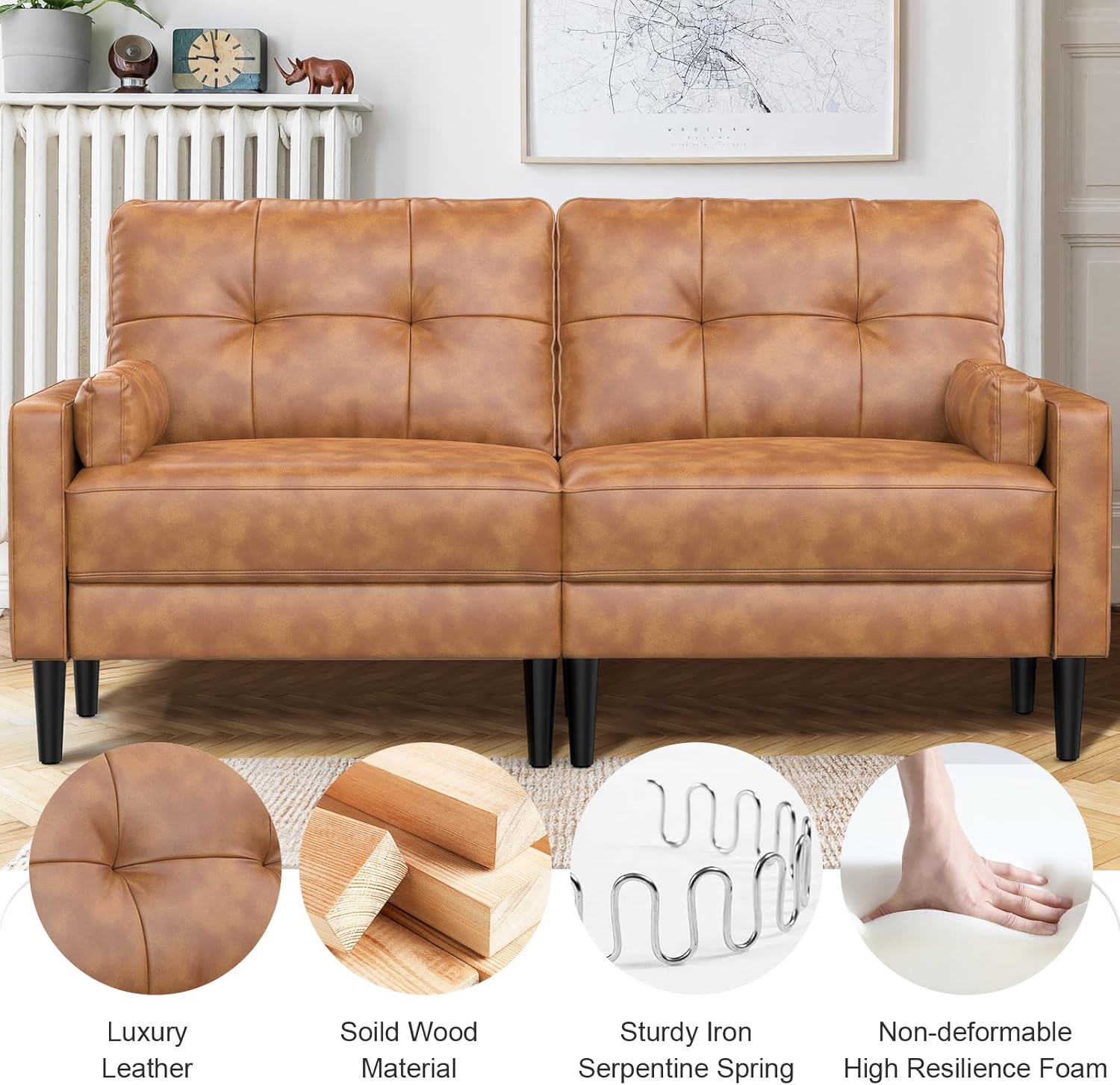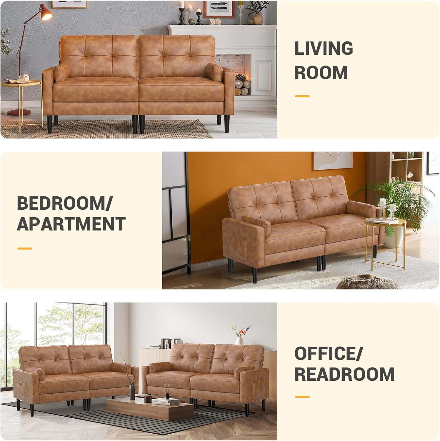 Aotumm Ciort Sofa 2 Plazas, Sofá Moderno con Cojines Gruesos, 2 Almohadas, Cómodo Sofá de Cuero con 2 Bolsillos de Almacenamiento para Sala de Estar/Dormitorio/Oficina, Sofá Pequeño (Marrón)