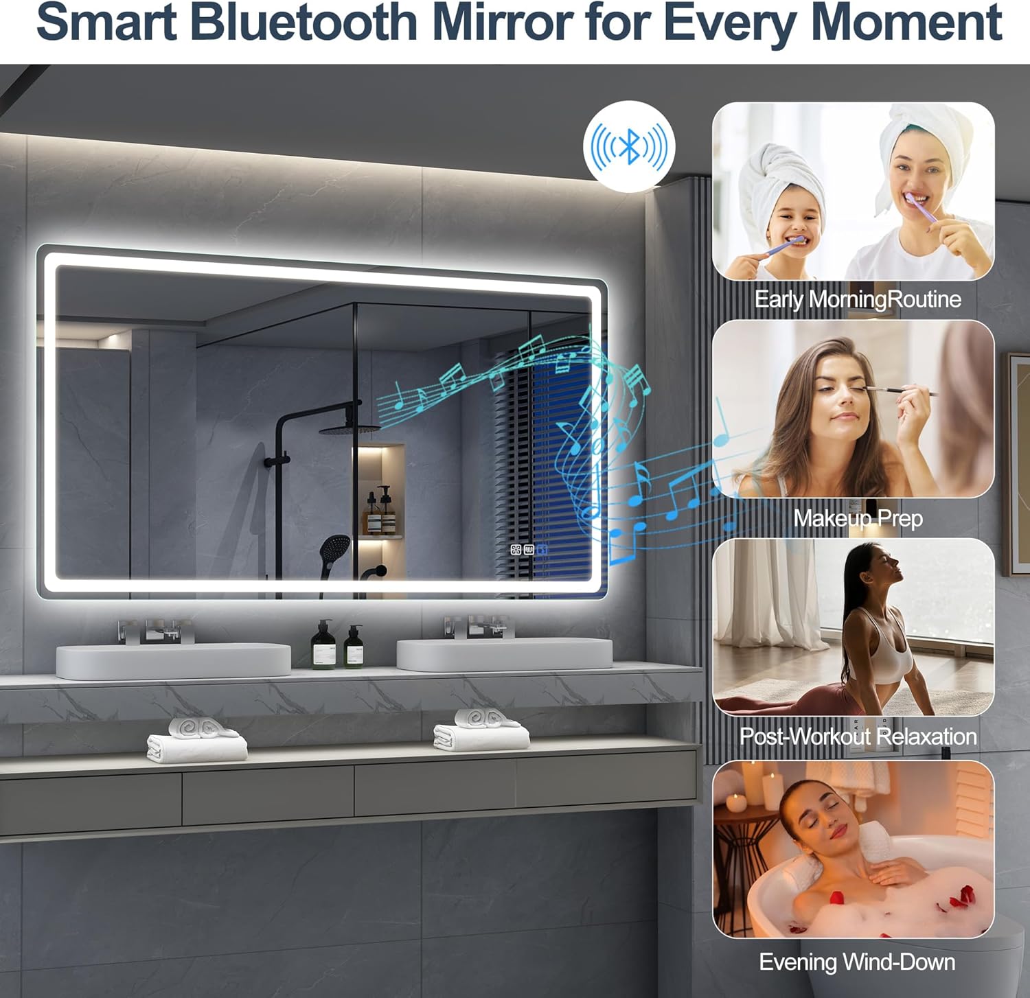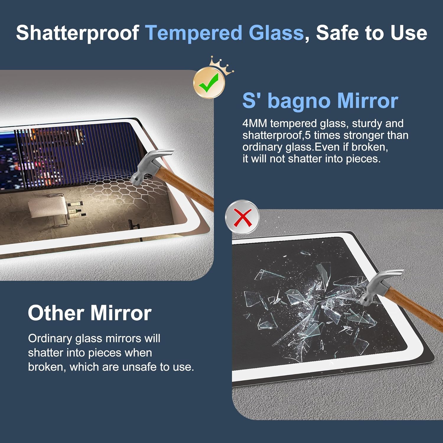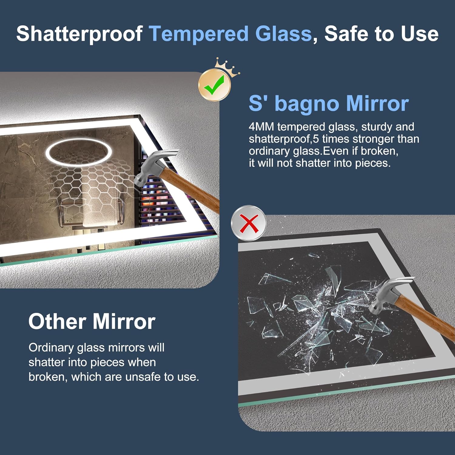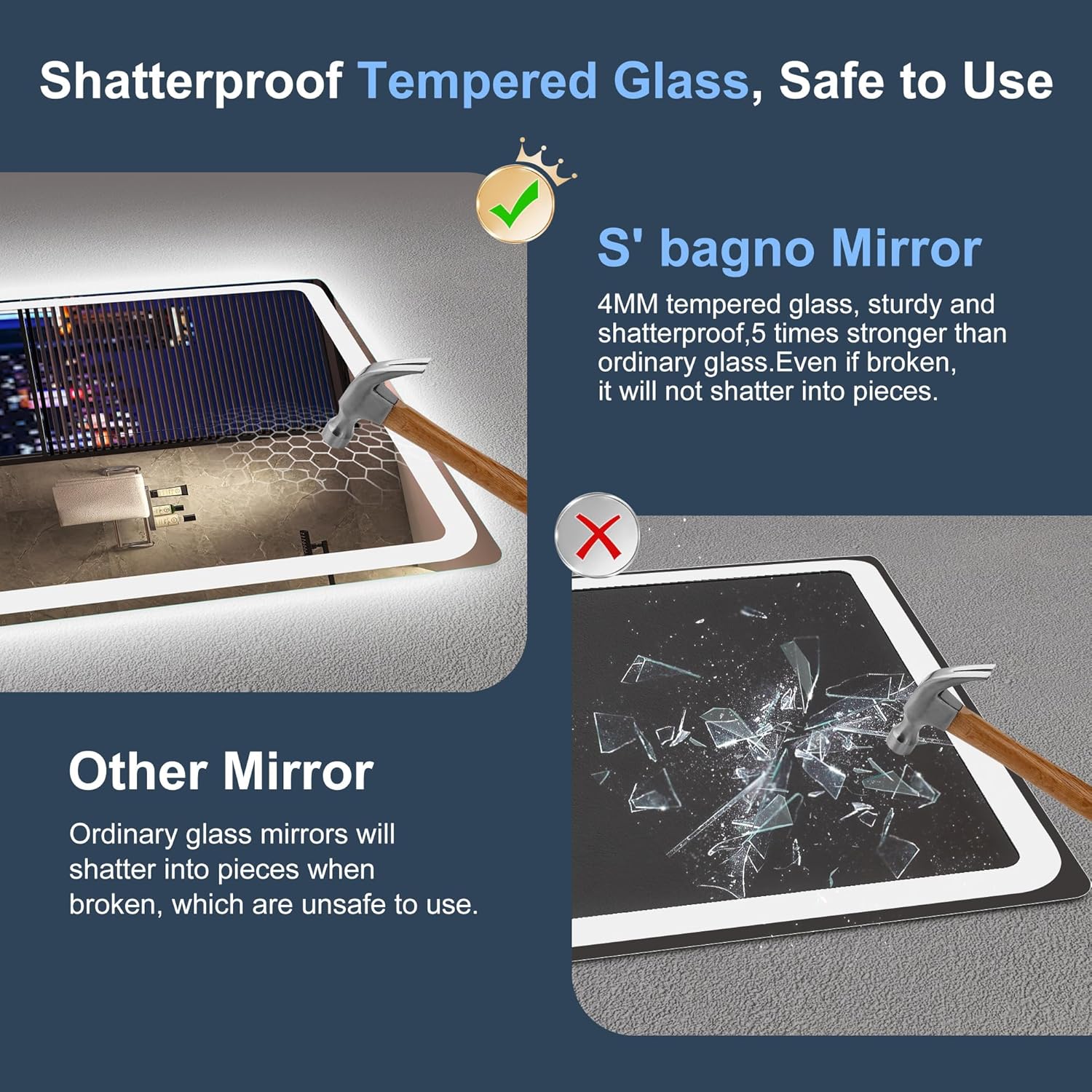 S'bagno Espejo-Baño-con-Luz 120x70cm, Espejo-Baño-LED-Bluetooth con Función Antivaho, 3000K/4000K/6500K, Regulable, Memoria, Cristal Templado HD, IP44-Espejos-de-Baño-con-LED, Horizontal/Vertical