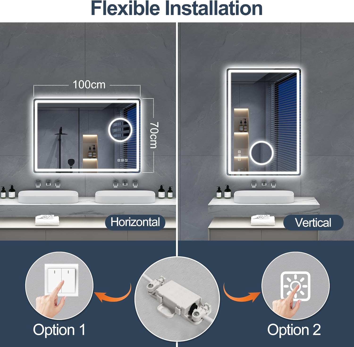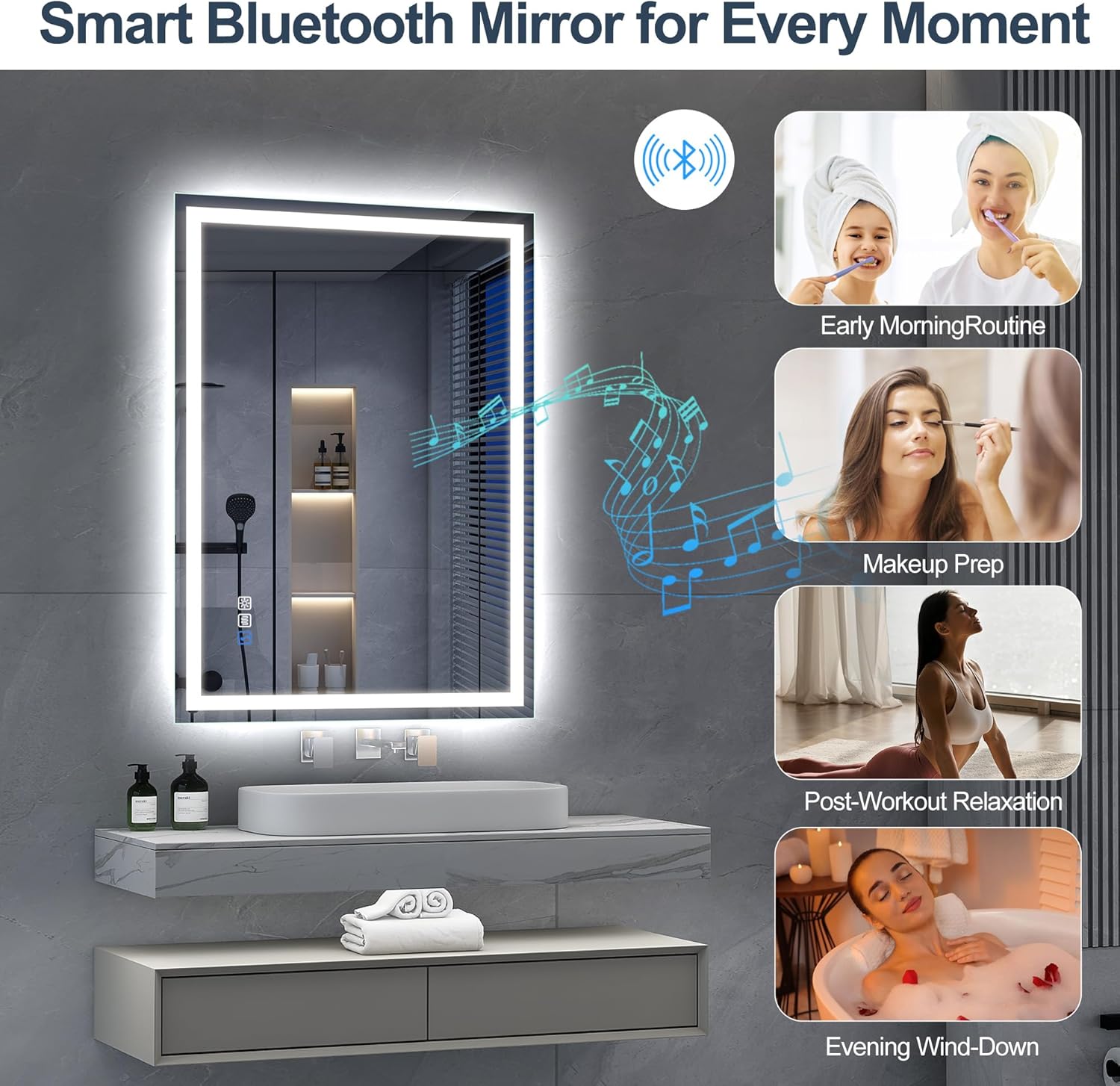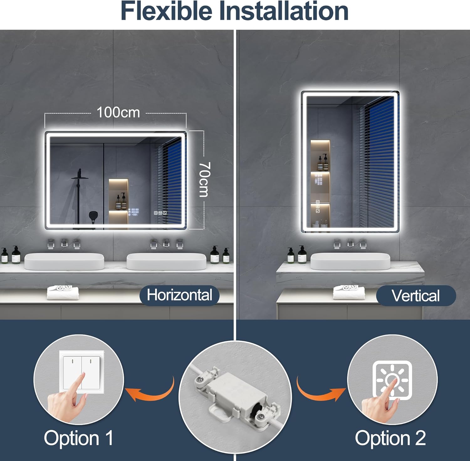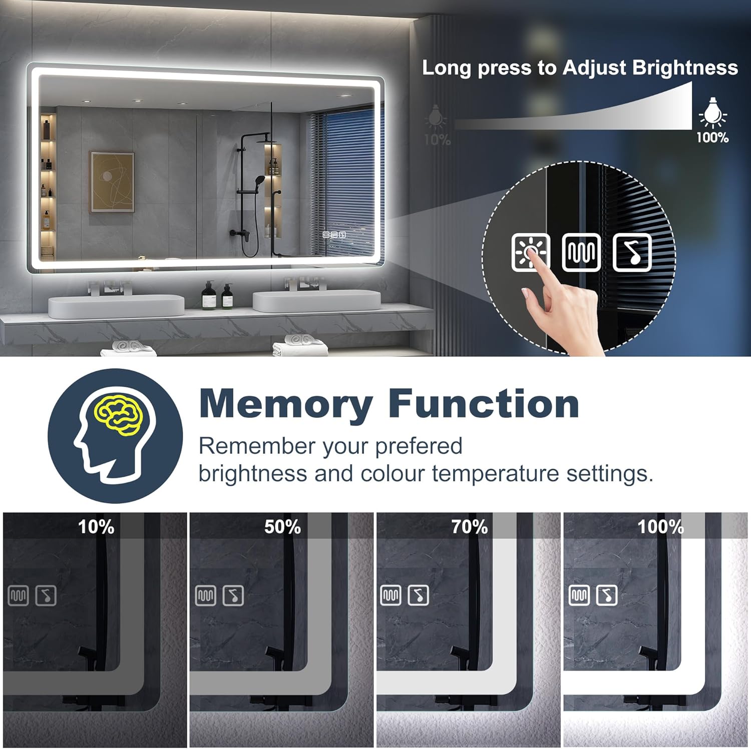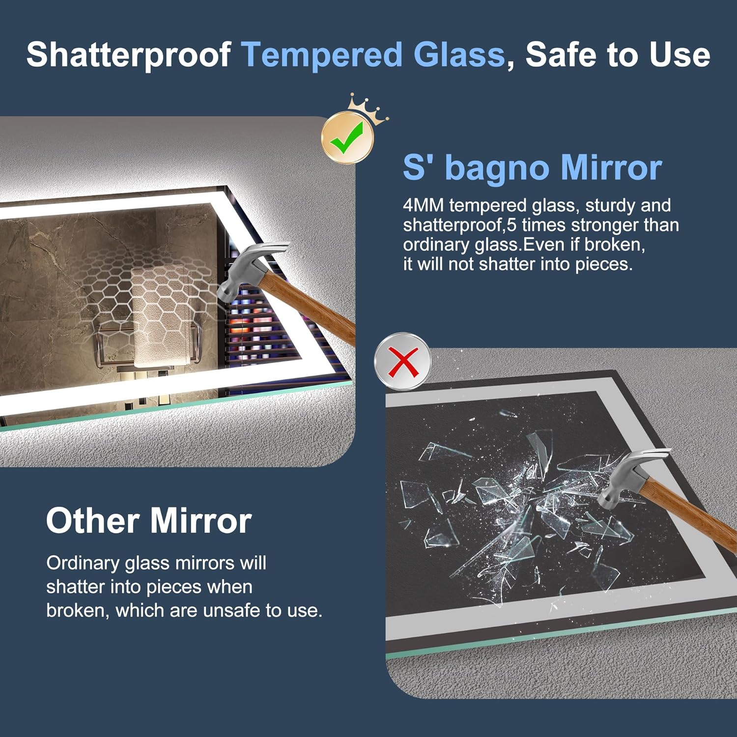 S'bagno Espejo-Baño-con-Luz 120x70cm, Espejo-Baño-LED-Bluetooth con Función Antivaho, 3000K/4000K/6500K, Regulable, Memoria, Cristal Templado HD, IP44-Espejos-de-Baño-con-LED, Horizontal/Vertical