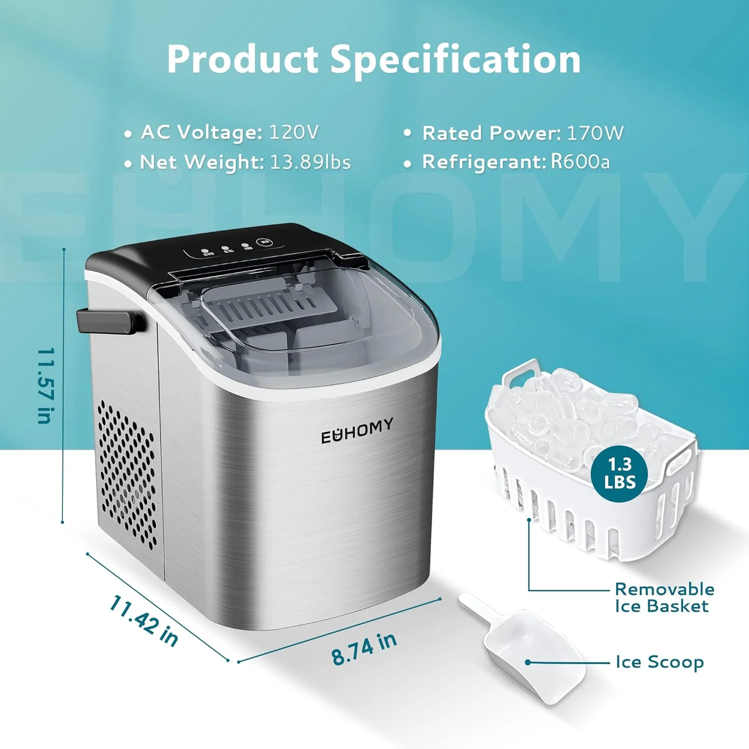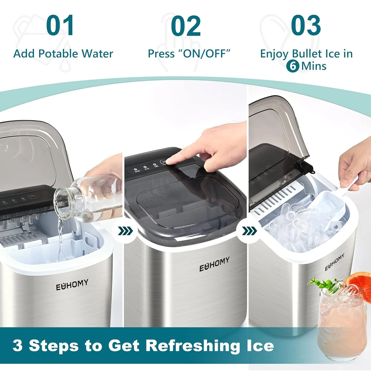 2025 Máquina de hielo portátil EUHOMY Silver Bullet de 12'' con asa – Eficiencia energética