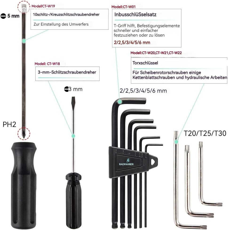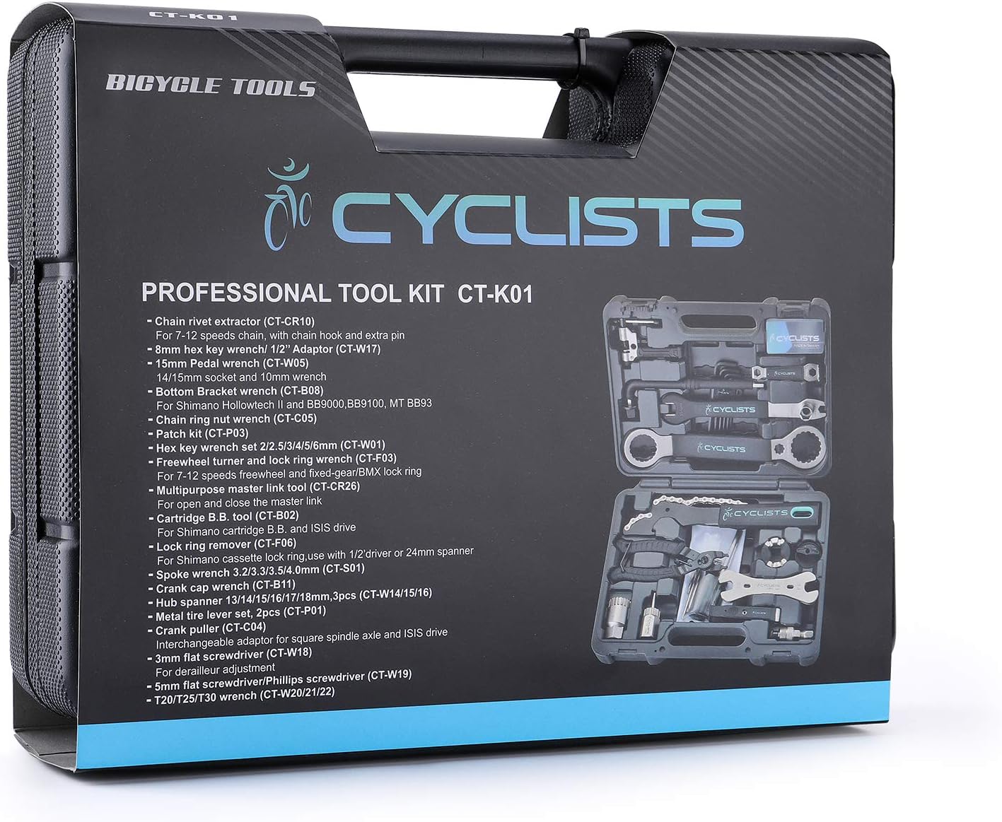 cyclists Juego de reparación de bicicleta de 23 piezas, portátil, maletín de herramientas para bicicleta, juego de herramientas para montar neumáticos y cadena, con maletín de transporte (Negro)