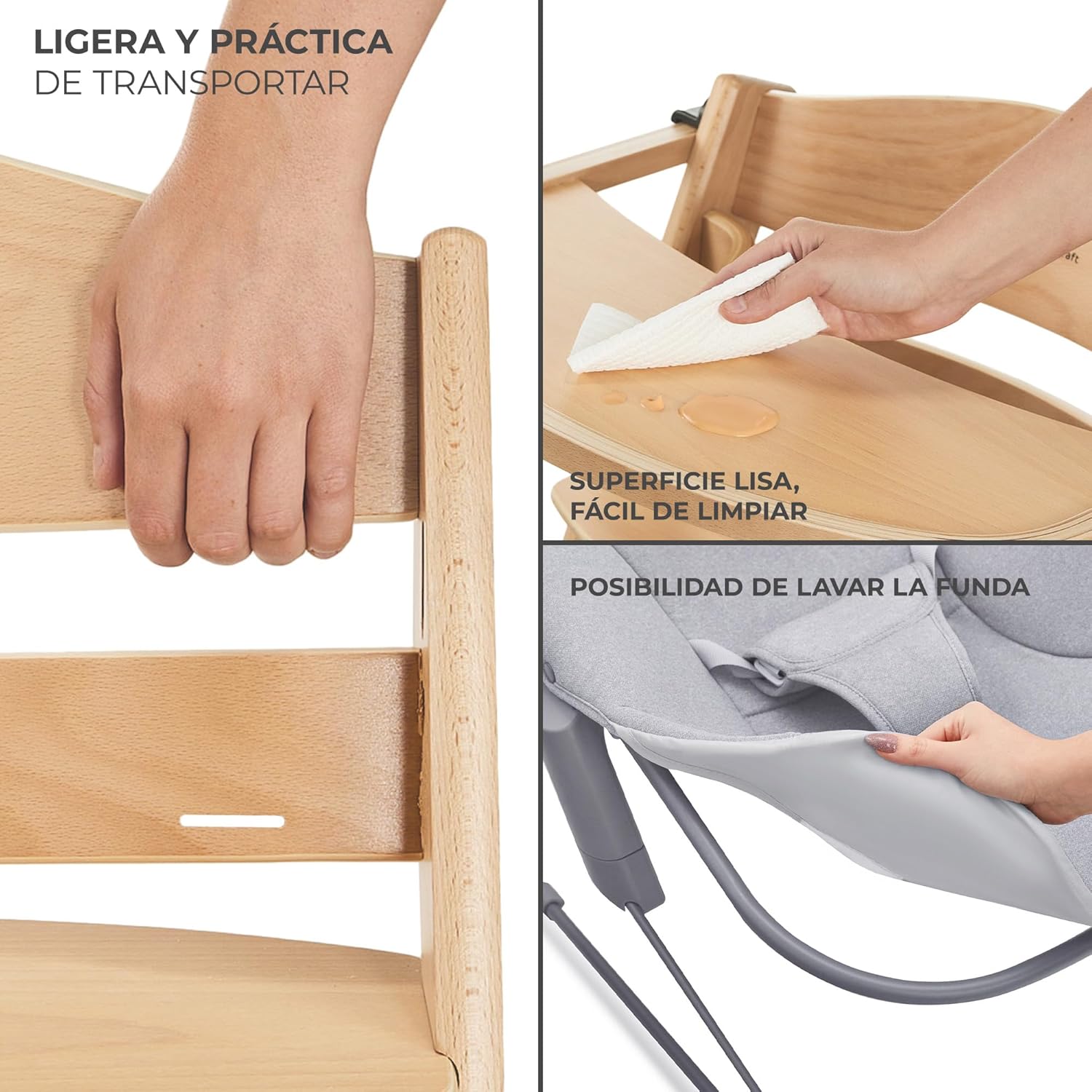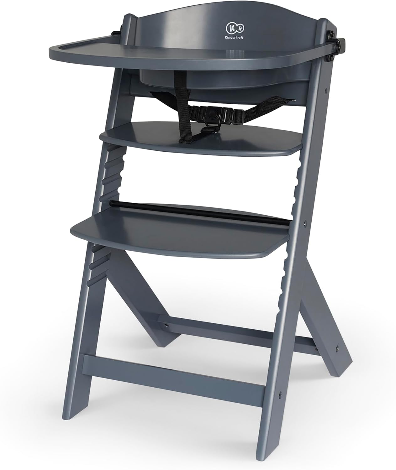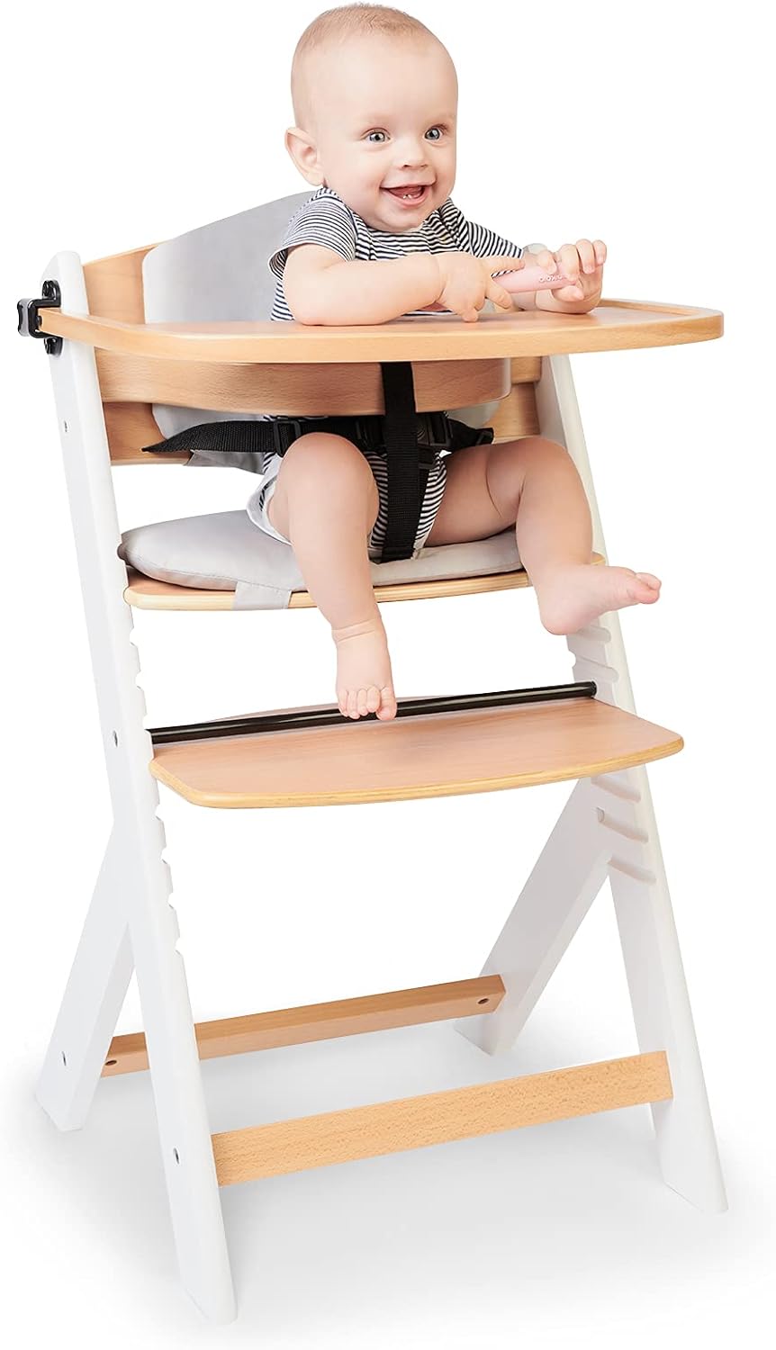 Kinderkraft ENOCK Trona bebé de Madera + Hamaca Bebé CALMEE, portatil, para niños, Silla alta Infantil, Evolutiva, Ergonómica, Barrera y Bandeja, Gris