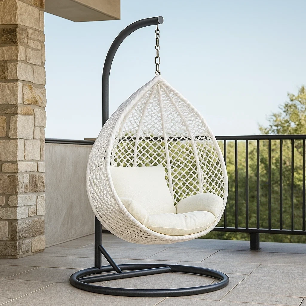 Sillón colgante de ratán sintético con cojín blanco y estructura metálica,instalación suspendida,tamaño 110x100x200 cm,para jardín o terraza - BgoLatphjVDo