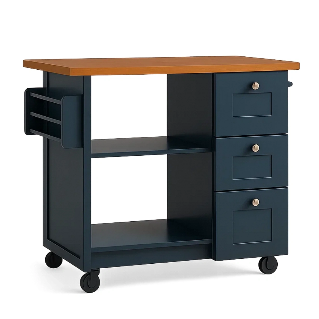 Isla cocina,forma rectangular,de madera MDF,azul oscuro,con encimera marrón,con puertas correderas,cajones y estantes abiertos,117x40x88 cm,uso doméstico. - 9Y4AafUfCwhm