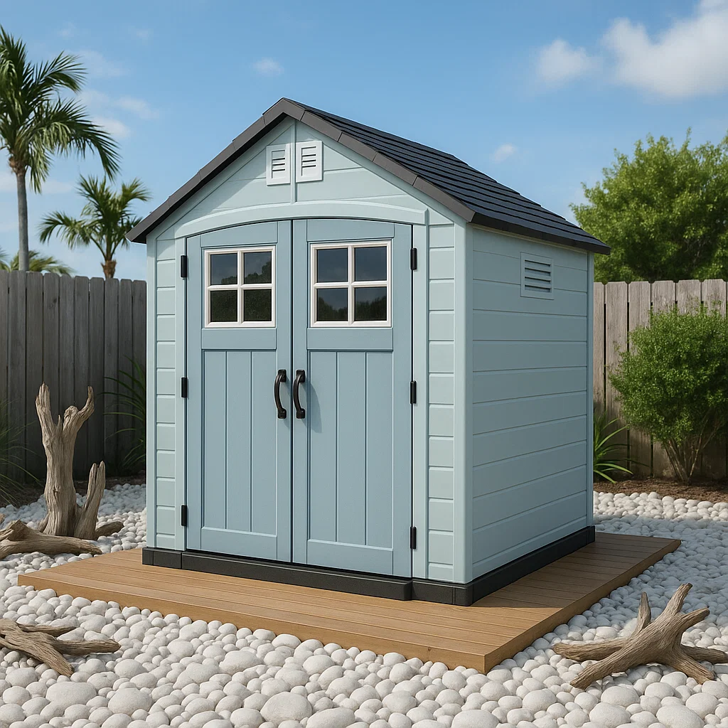 Caseta de jardín, caseta de almacenamiento color azul claro y negro de resina para exterior, 185x160x215 cm zUiKhpO201Mh