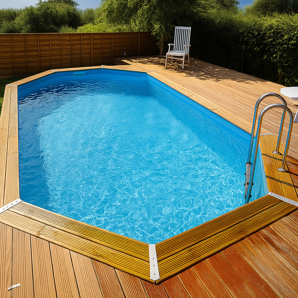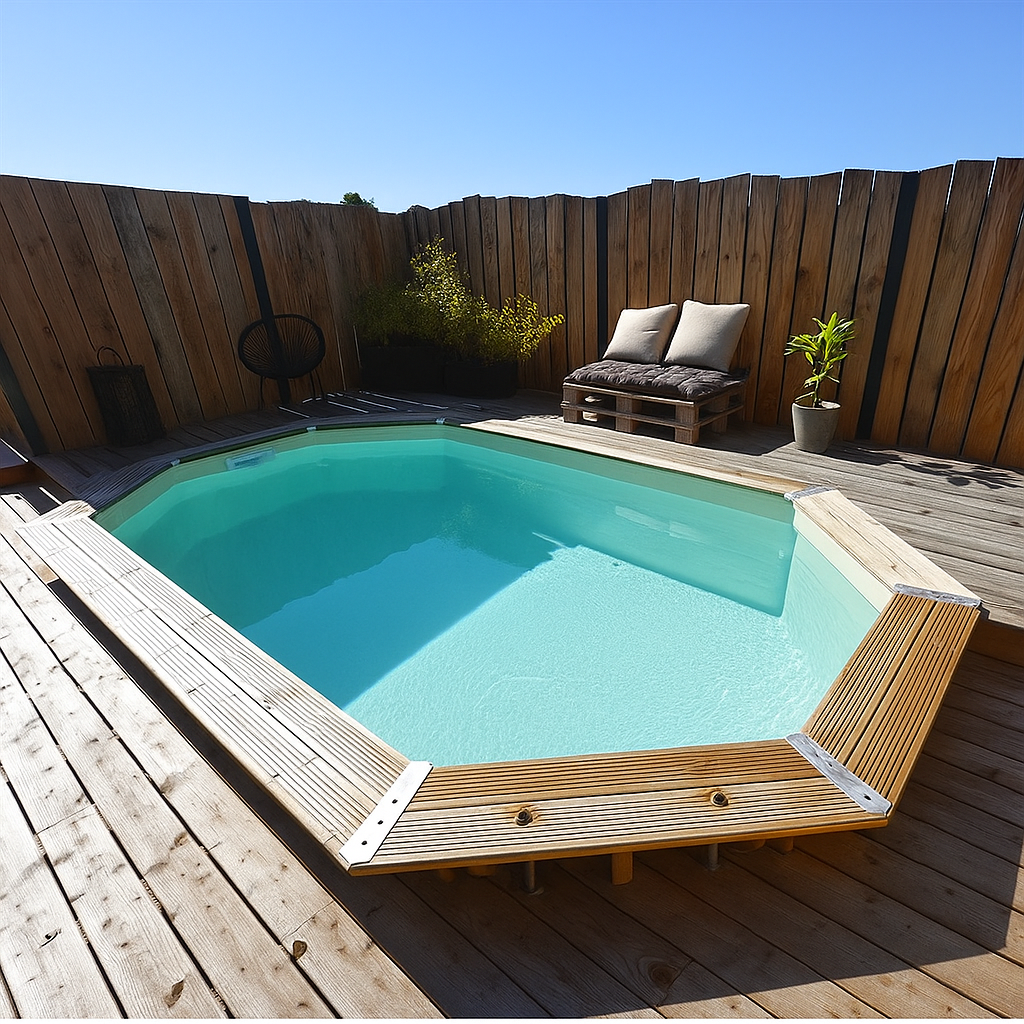 Piscina elevada forma octogonal rectangular madera natural madera jardín exterior