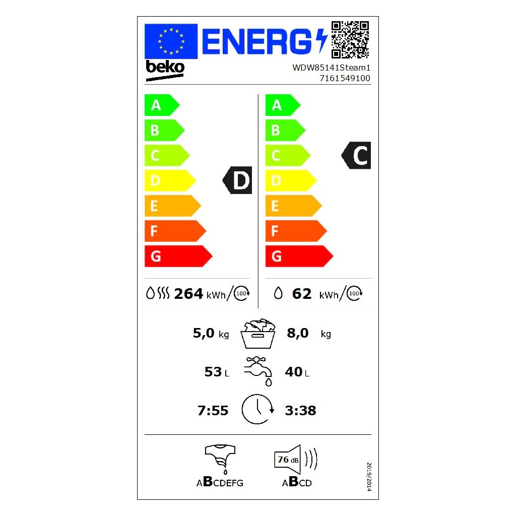 2025 Lavadora-secadora Beko WDW85141 Steam1, 1400 rpm, puerta XL, vapor, blanca