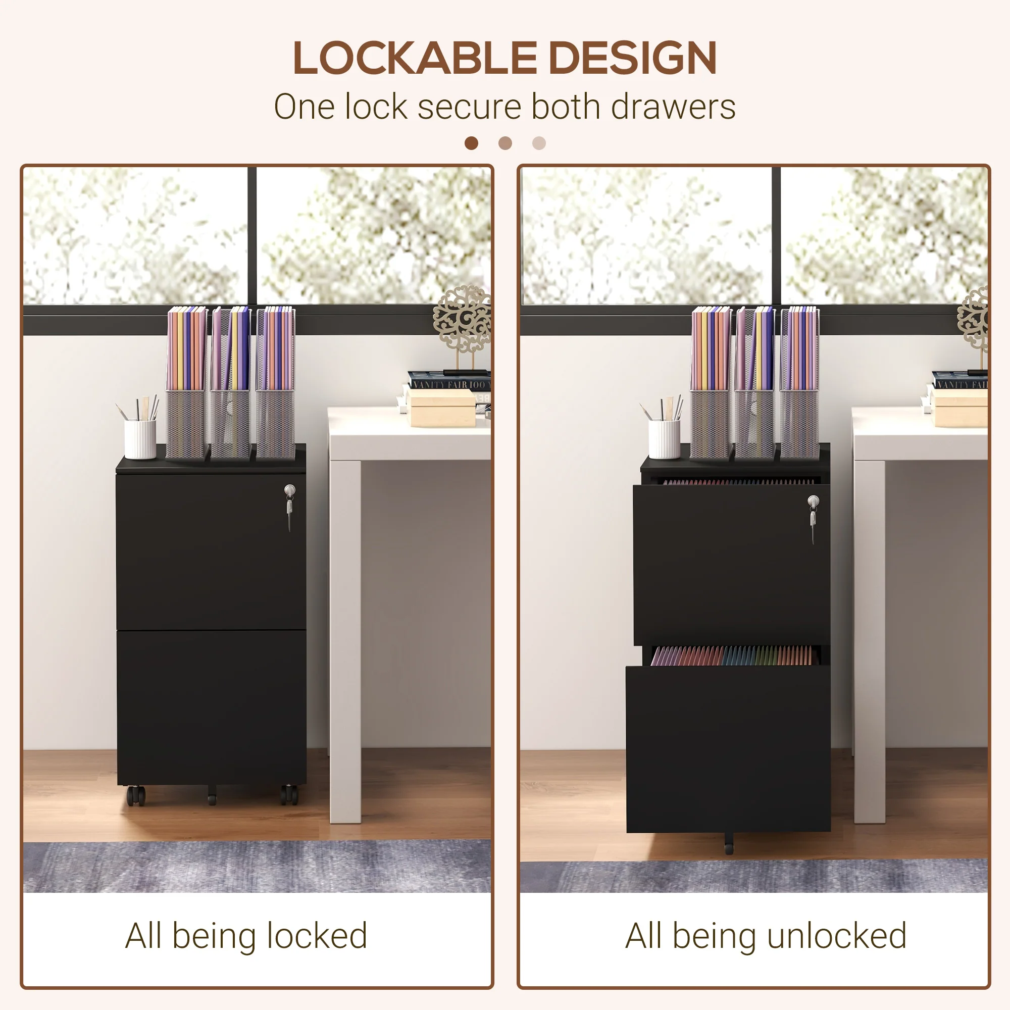 Archivador Móvil con 2 Cajones, Mueble de Archivo Cerrable de Acero, Cuerpo Preensamblado, Negro