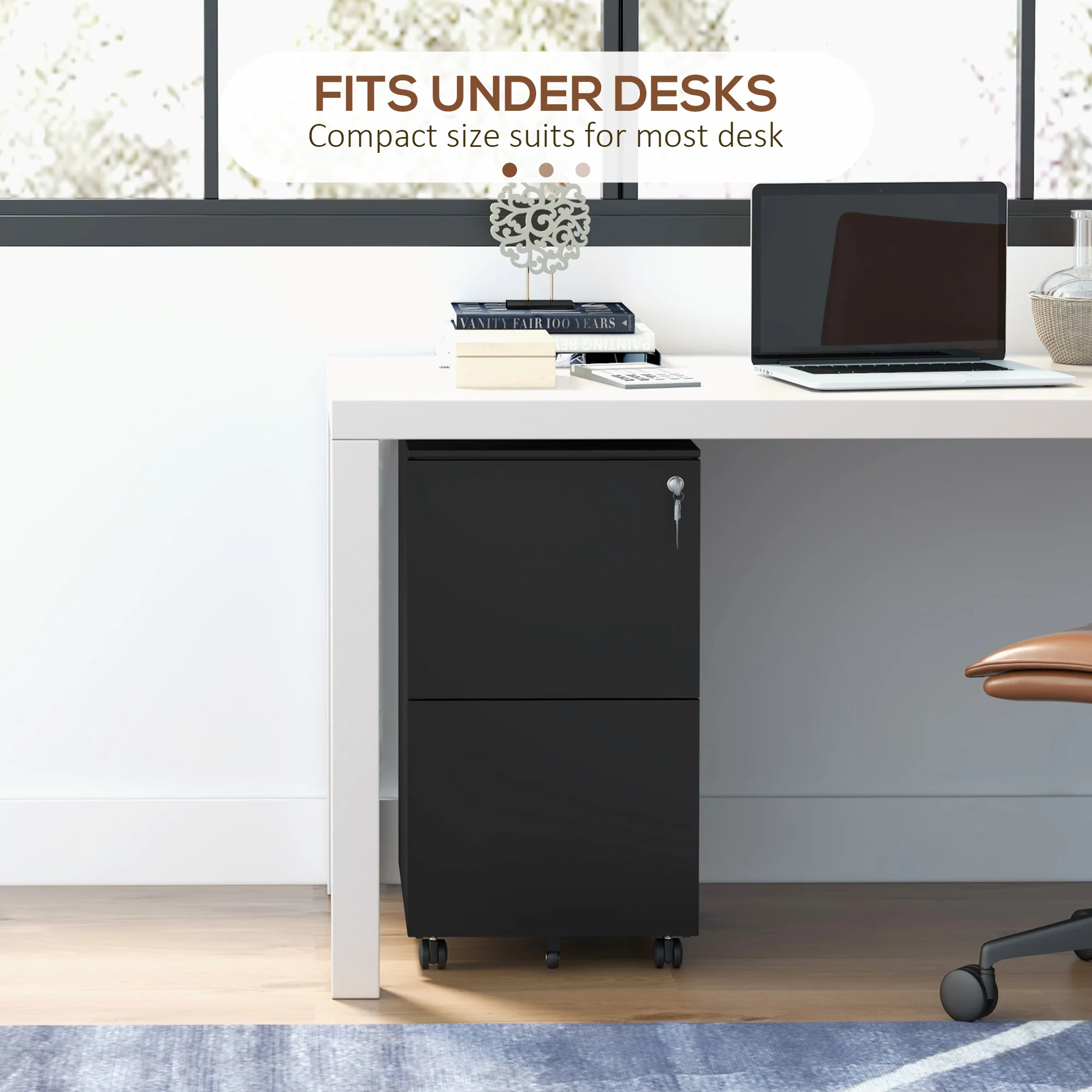Archivador Móvil de Acero con 2 Cajones y Cerradura, Mueble de Oficina para Debajo del Escritorio, Negro