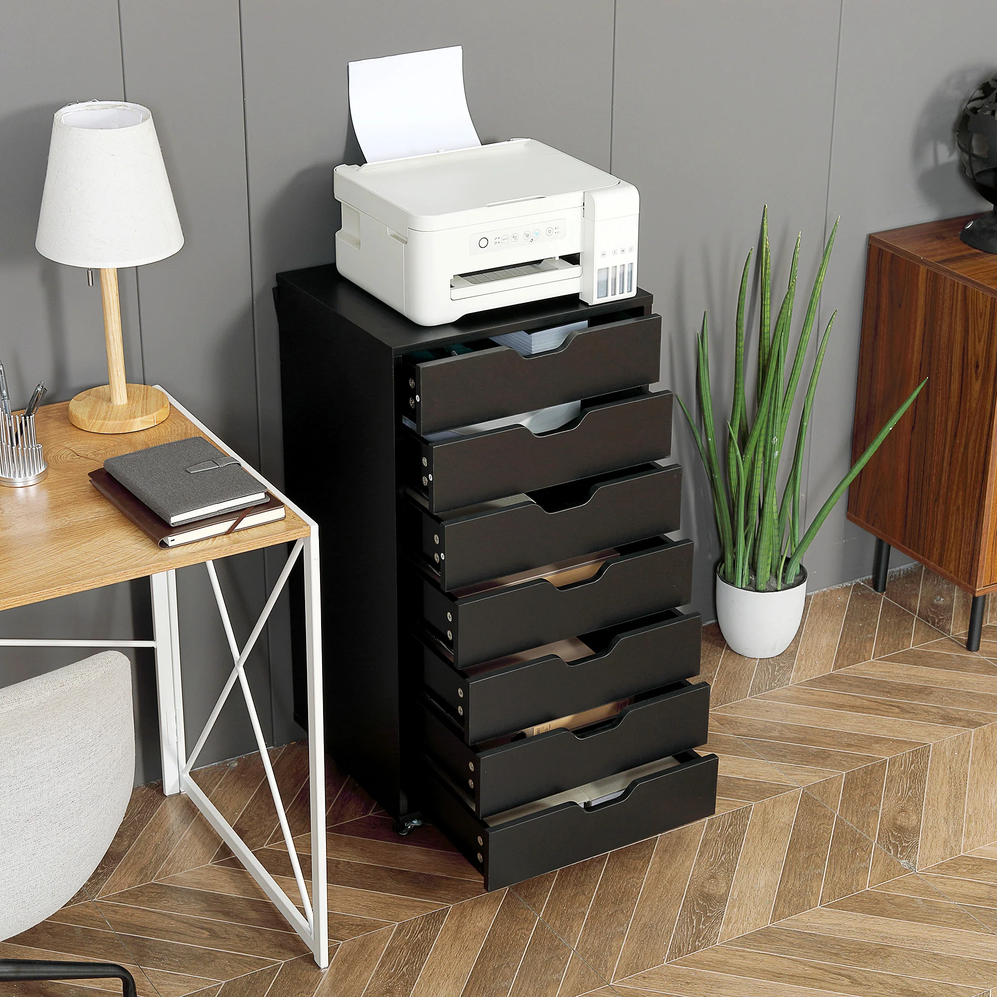 Cajonera Vertical de 7 Cajones, Mueble de Oficina Móvil con Ruedas, Negro