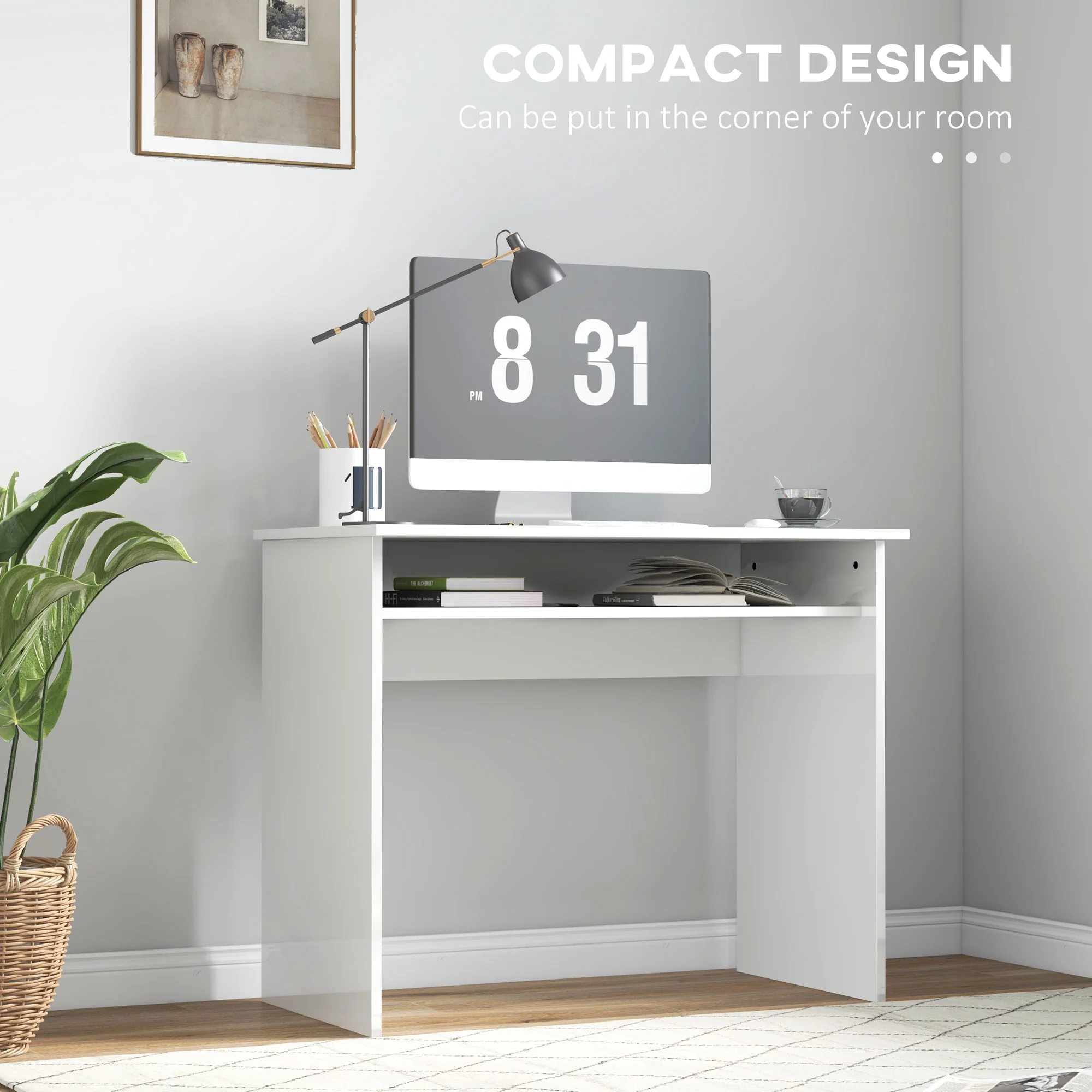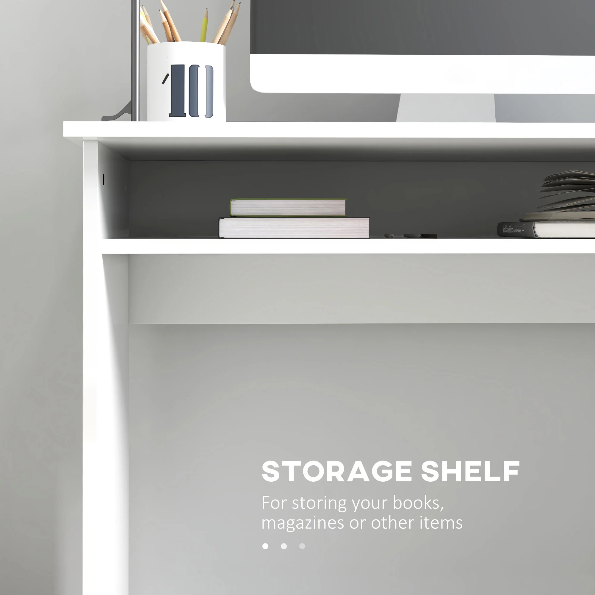 Escritorio de Ordenador Moderno, Escritorio Pequeño con Estante de Almacenamiento, 90 x 50 cm, Blanco Brillante